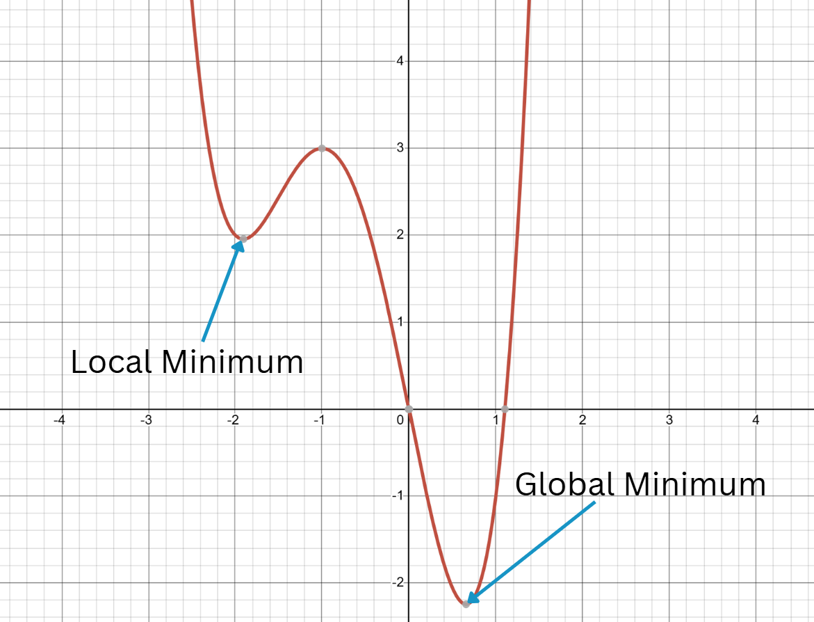 A local minimum is a point where the function’s value is lower than all nearby points, but not necessarily the lowest overall.