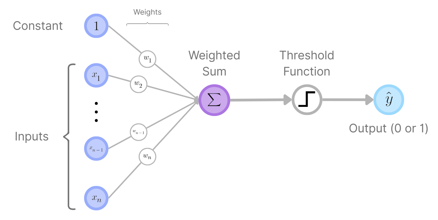 the perceptron to shift its decision boundary. \(b\), which produces a weighted sum: \(z = w_1x_1 + w_2 x_2 + \cdots + w_n x_n + b\).