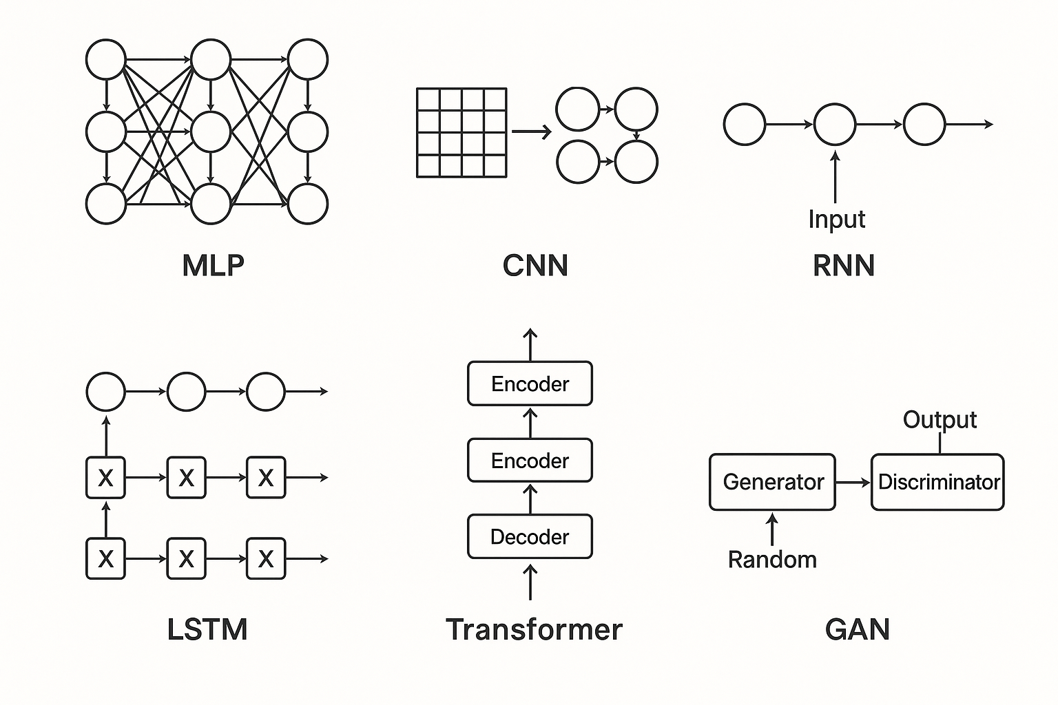 So far, we have only covered one type of neural network: the feedforward neural network (FNN) (otherwise known as a multilayer perceptron (MLP)). But there exist hundreds more "varieties" of networks that we haven't discussed, each of which work in a slightly different way. Over the years, we have developed many different “architectures”, each optimised for solving specific kinds of problems. Here are some of the major types: