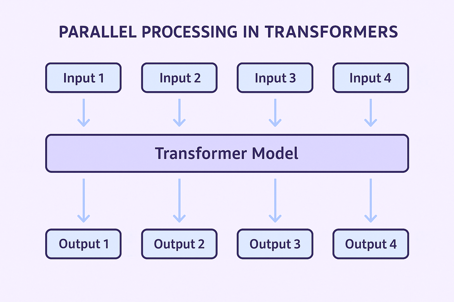 Parallel processing is when a model processes all elements of a sequence at the same time instead of one by one, allowing faster computation and better handling of
